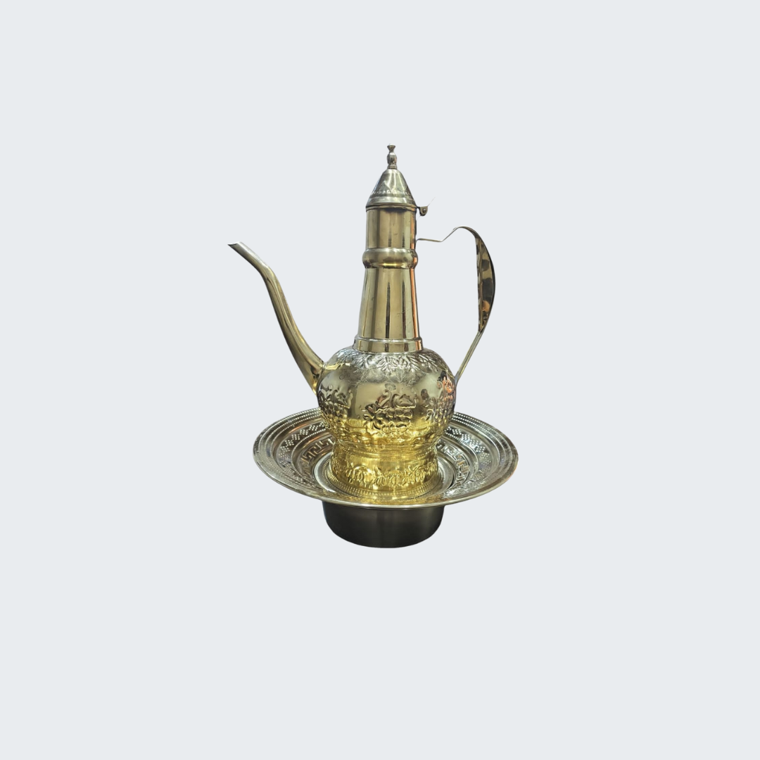 The “Set Golden Surahi & Chimchi” is a beautifully crafted traditional brass teapot set, designed with exquisite details. The Surahi (teapot) features a long spout and a gracefully curved handle, allowing for easy and stylish pouring. The matching Chimchi (tray) is embossed with intricate patterns that complement the teapot’s design, making this set both functional and ornamental. This elegant set is traditionally used for serving tea, coffee, or other ceremonial drinks in Middle Eastern and South Asian cultures. With its antique golden brass finish, this set adds a vintage charm to any table and serves as a stunning decorative piece for your home, enhancing both the aesthetic and cultural ambiance.